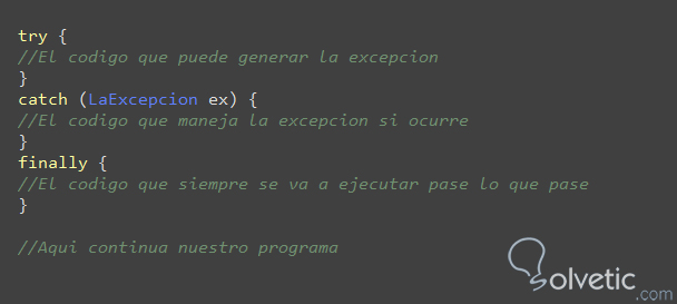 - Si ocurre una excepción en el bloque try{} su ejecución se detendrá y luego pasará a ejecutarse el bloque catch(){}, finalmente se ejecutara el bloque finally{} y se ejecutara el siguiente código del programa.