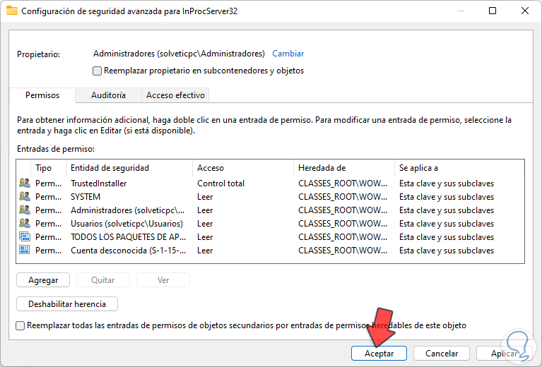 Damos clic derecho sobre "InProcServer32" y seleccionamos "Permisos":