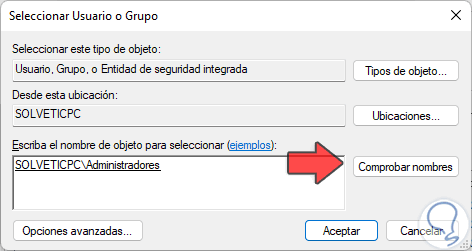 en la ventana emergente ingresamos "Administradores" y damos clic en "Comprobar nombres":
