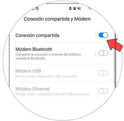En el interruptor de “Conexión compartida” podemos activar o desactivar esta opción. En este caso debes activarla.