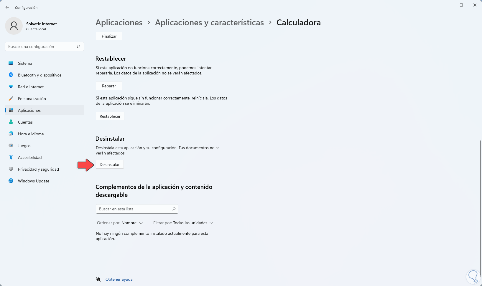 Este primer método nos permite desinstalar la calculadora desde la utilidad Configuración y luego proceder a su reinstalación.