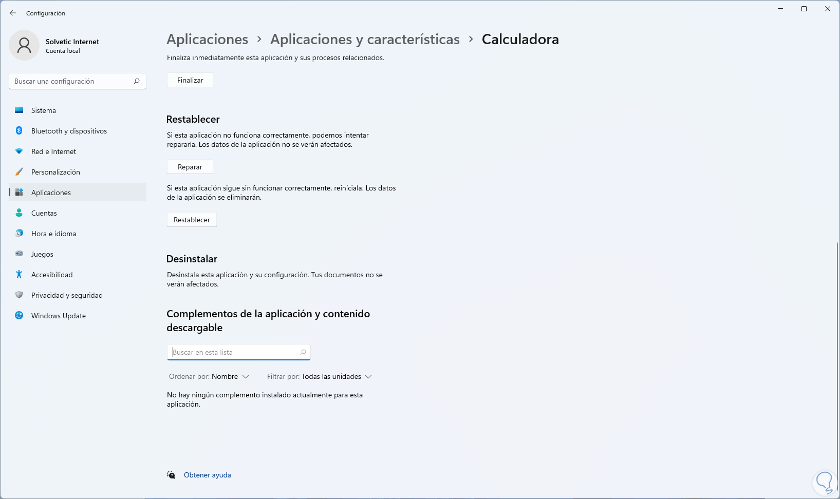 1. Reinstalar Calculadora Windows 11 desde Configuración