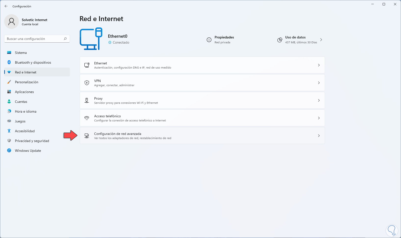 Vamos a la sección “Red e Internet”. Damos clic en "Configuración de red avanzada"
