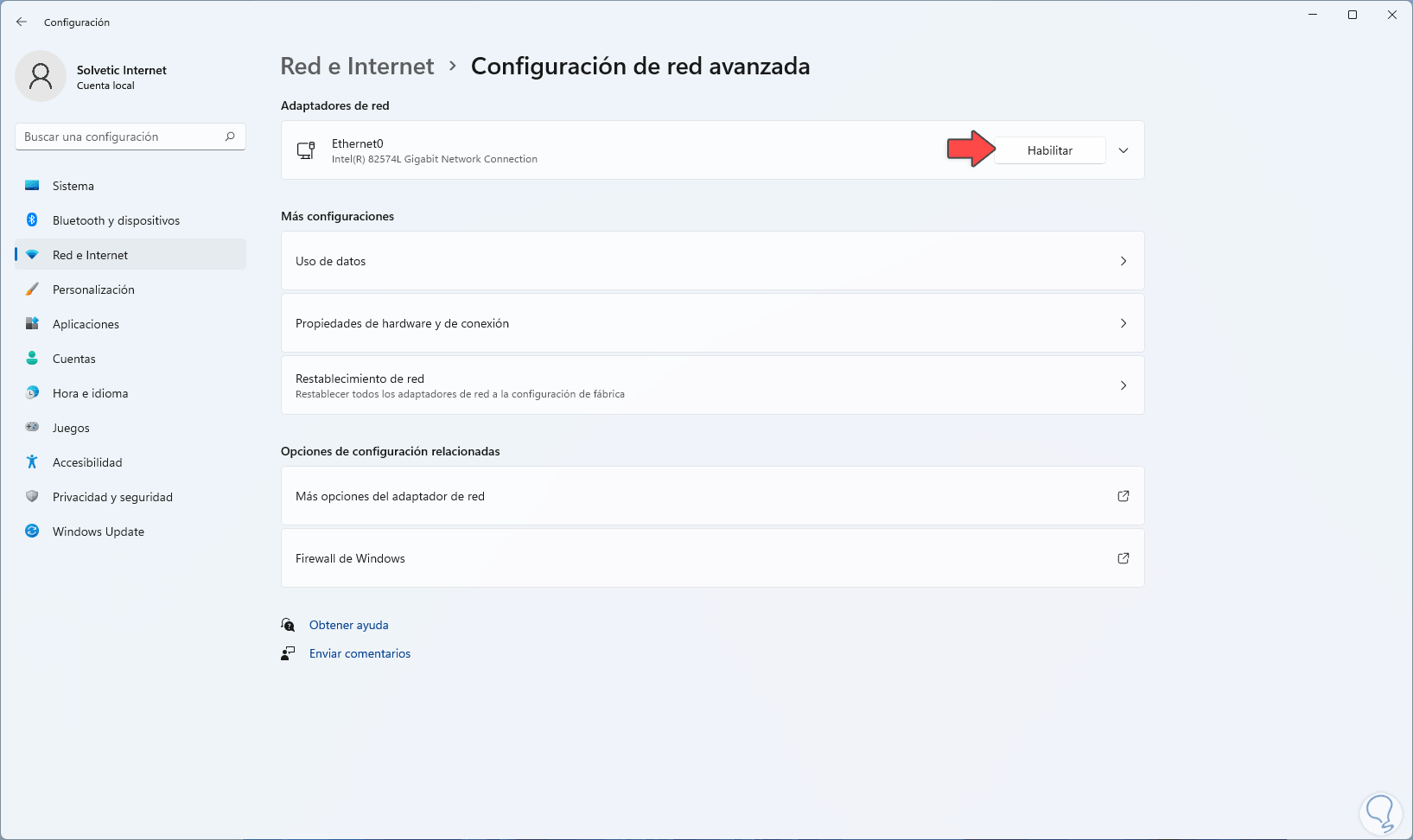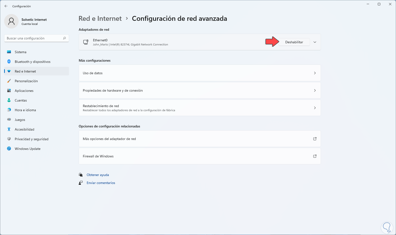 1. Deshabilitar Tarjeta de Red Windows 11 desde Configuración