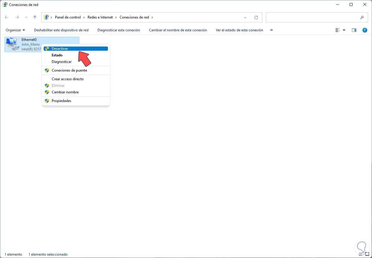 Seleccionamos "Ver conexiones de red", luego damos clic derecho sobre el adaptador de red y seleccionamos la opción "Desactivar":