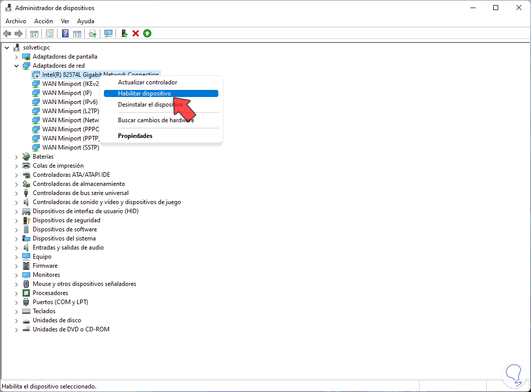 Para habilitarlo damos clic derecho sobre el adaptador y seleccionamos "Habilitar dispositivo":