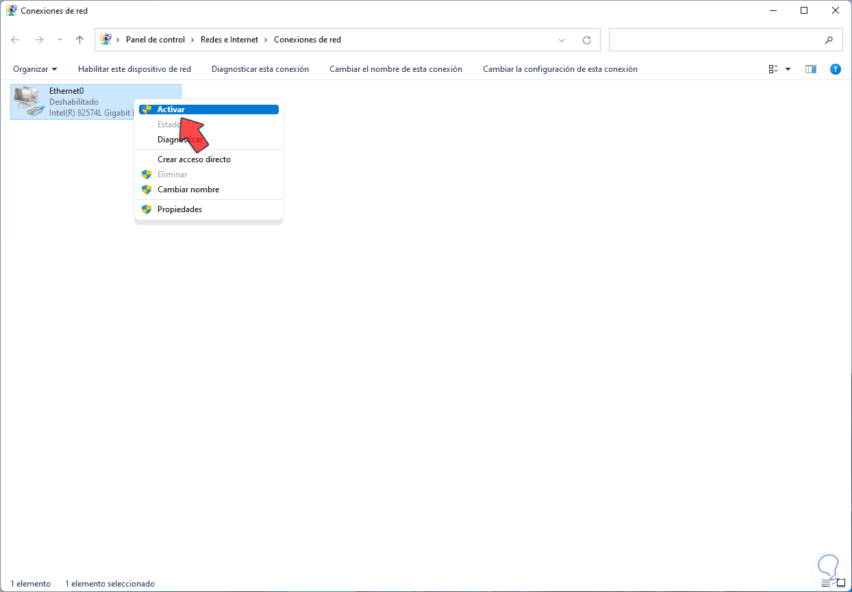 El acceso a la red se desactivará, para habilitarlo de nuevo damos clic derecho sobre el adaptador y seleccionamos la opción "Activar":