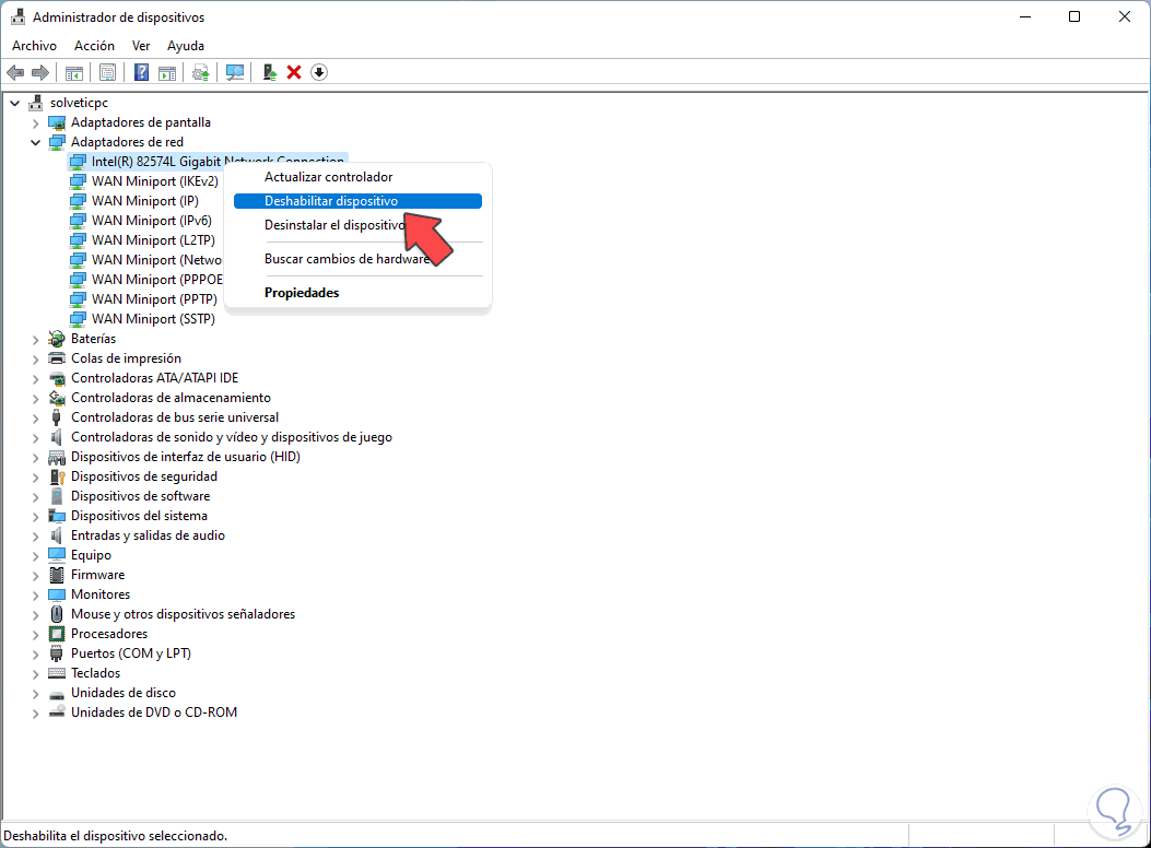 En "Adaptadores de red" damos clic derecho sobre el adaptador y seleccionamos "Deshabilitar dispositivo":