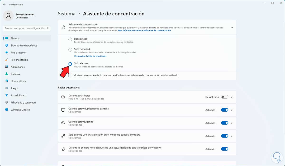 El Asistente de concentración en Windows 11 es una funcionalidad que nos permite configurar la privacidad del sistema esto con el fin de que no se generen alertas ni ningún sonido durante un periodo de tiempo específico.