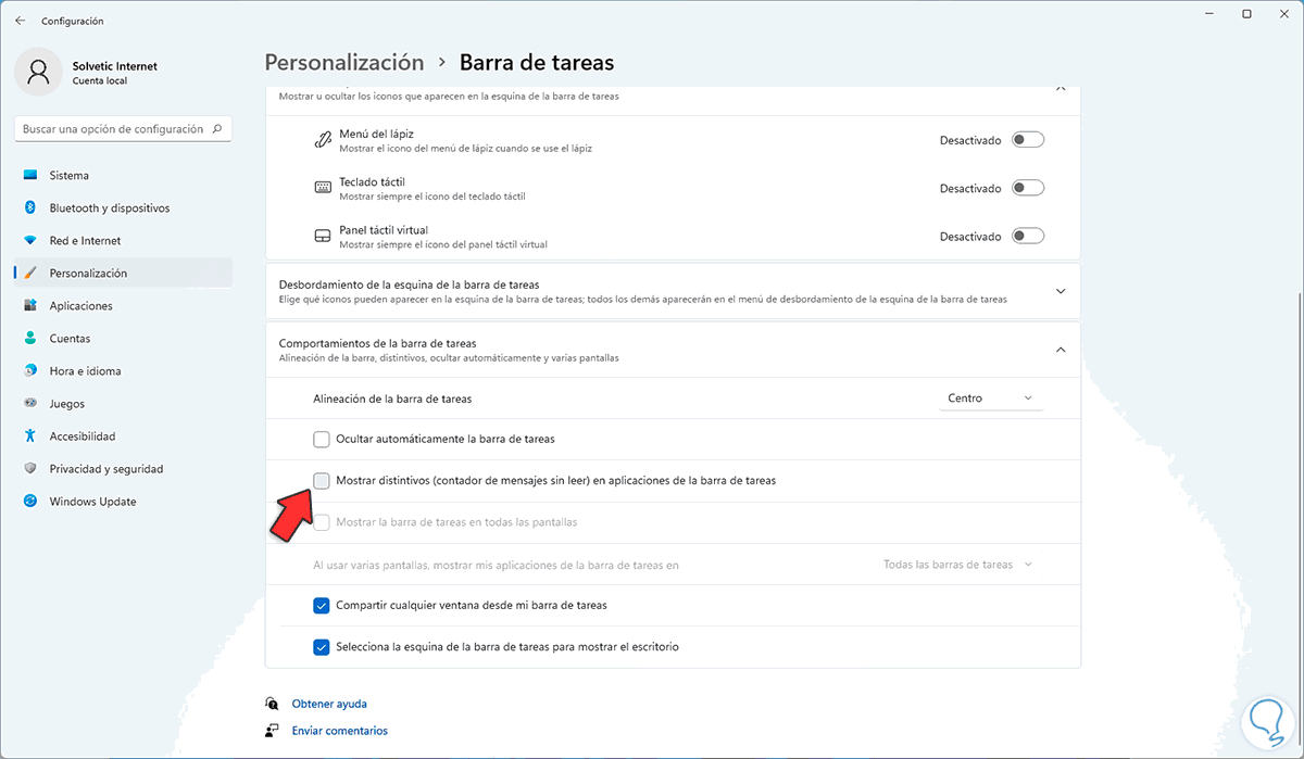 Desactivamos la casilla “Mostrar distintivos (contador de mensajes sin leer) en aplicaciones de la barra de tareas”: