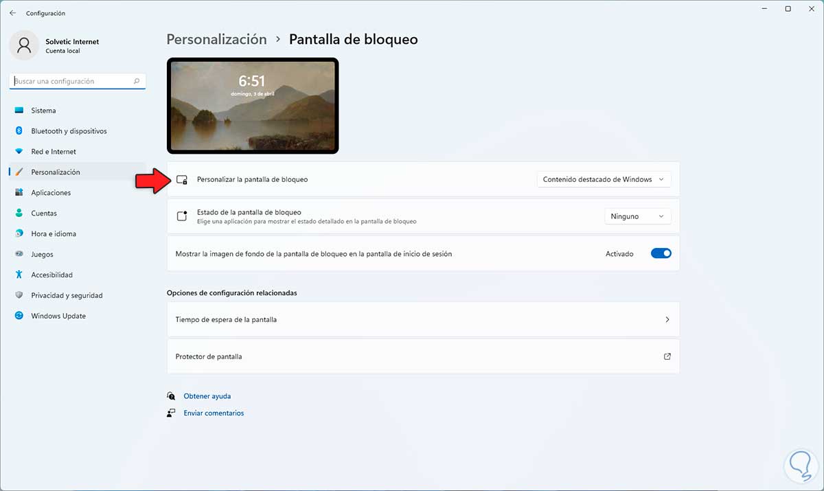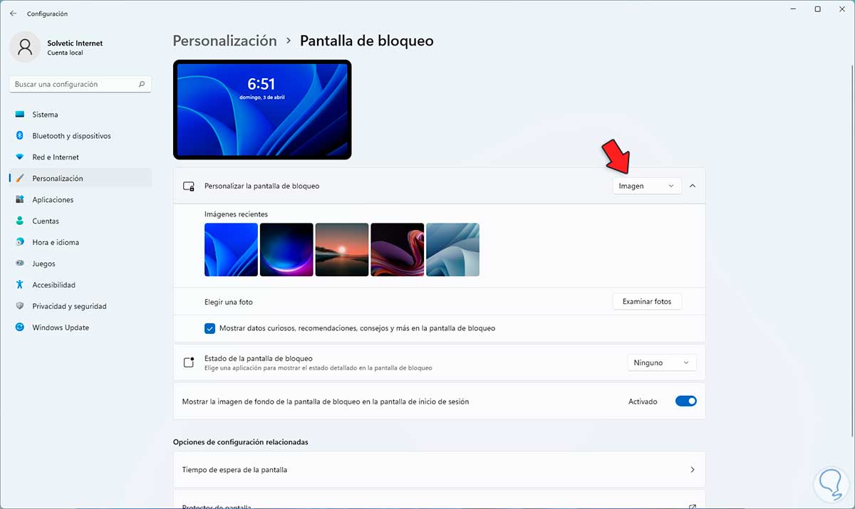 Damos clic en "Pantalla de bloqueo" y ahora veremos lo siguiente: