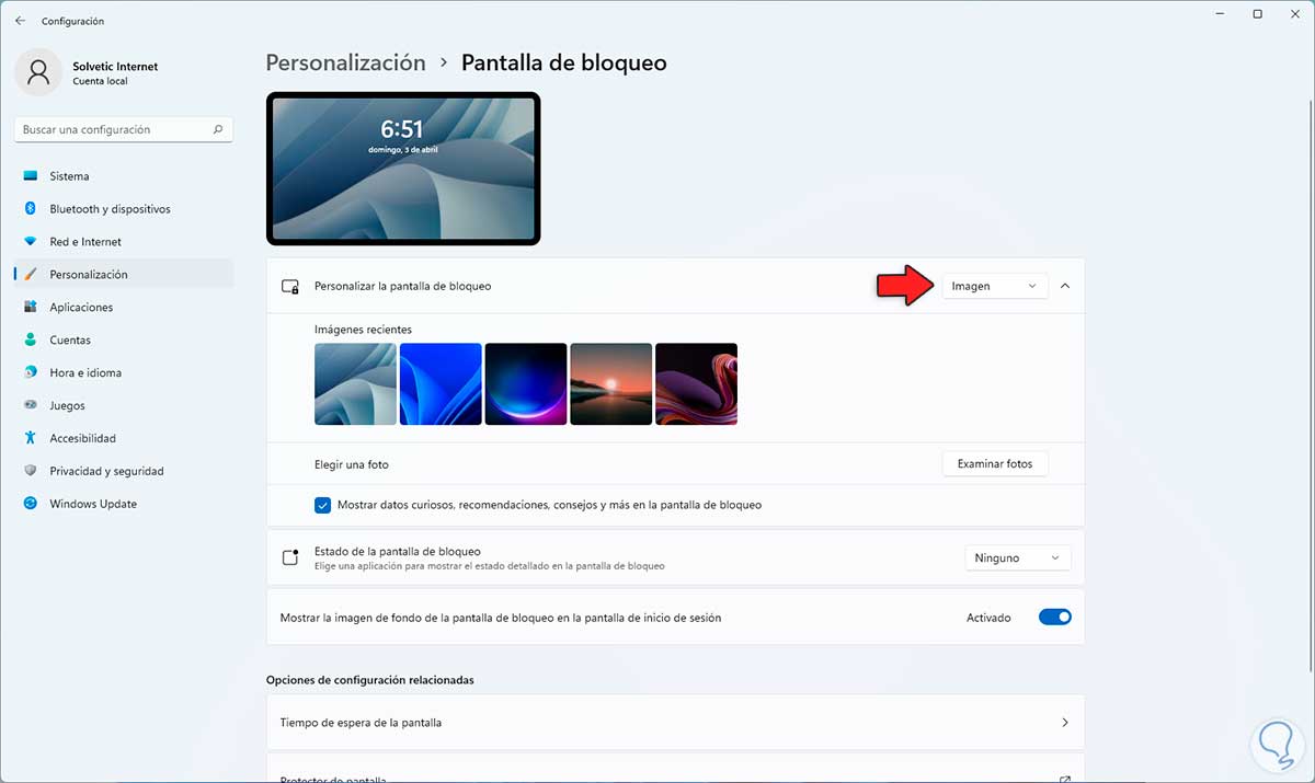 En "Personalizar la pantalla de bloqueo" seleccionamos la opción "Imagen":