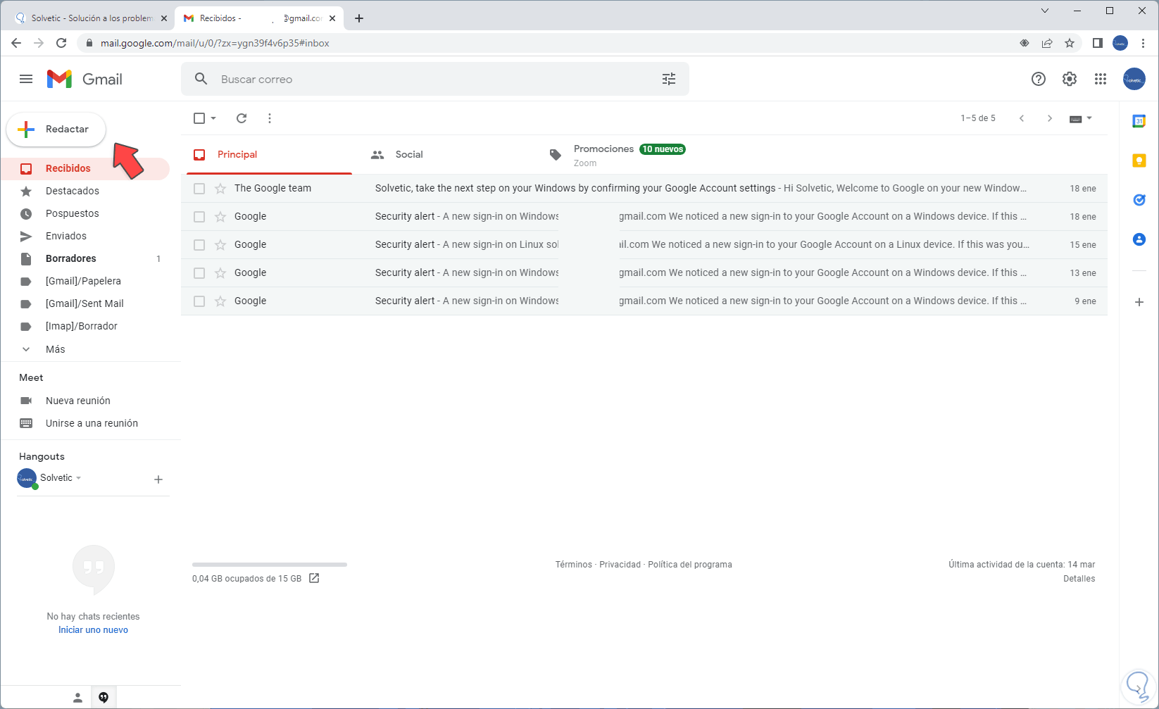 Abrimos Gmail y damos clic en "Redactar" para redactar un nuevo correo: