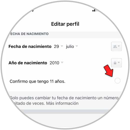 Lo que debes hacer es establecer una fecha de nacimiento que sea inferior a los 18 años y pulsa en guardar.