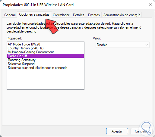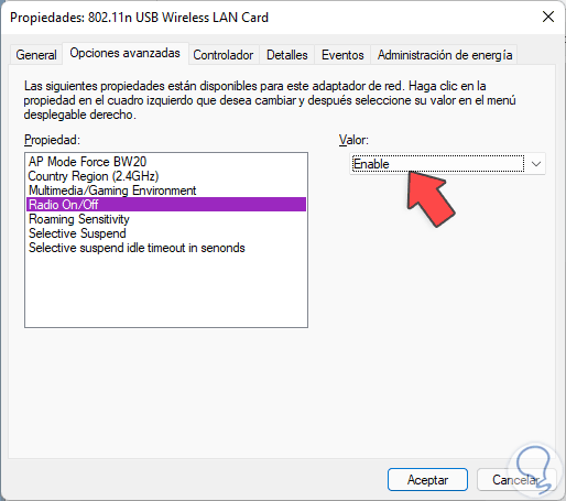 Seleccionamos el valor "Radio On/Off" y establecemos el valor "Enabled":