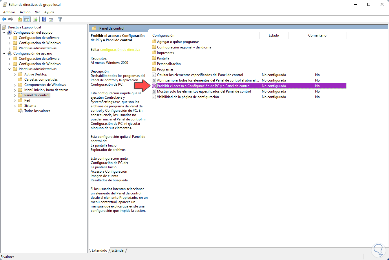 Seleccionamos la utilidad y ahora vamos a la ruta. Damos doble clic en la política "Prohibir el acceso a Configuración de PC y a Panel de control":