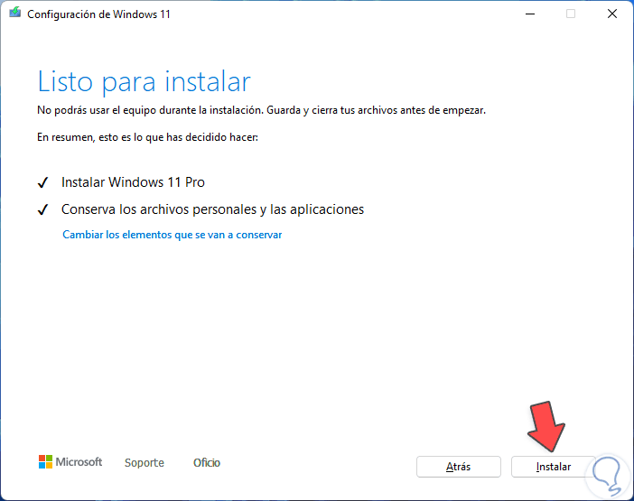Al finaliza, si todo paso las verificaciones, veremos esto. Damos clic en "Instalar" para reinstalar Windows 11