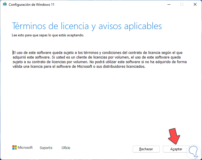 Descargamos la utilidad “Crear soportes de instalación de Windows 11”, ejecutamos el archivo descargado y en el asistente aceptamos la licencia: