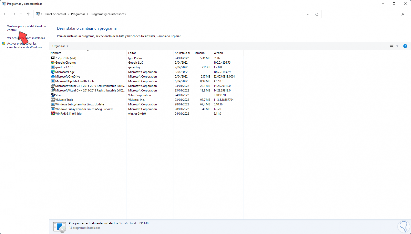 - Acceder a Programas y características