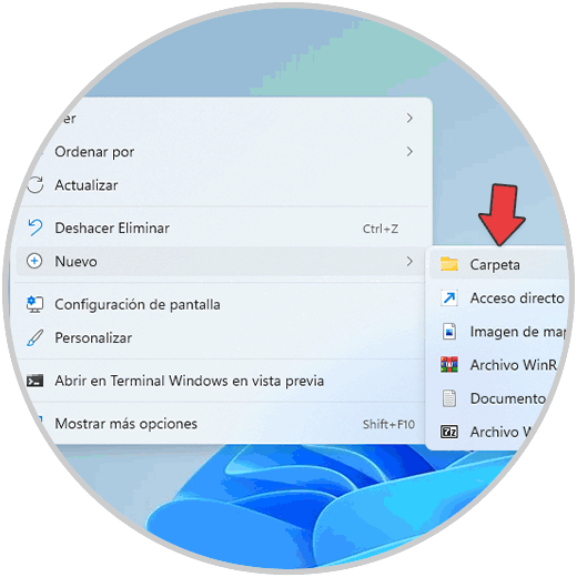 Con este método buscamos crear un acceso directo y desde allí acceder a las opciones del Panel de control, en este caso damos clic derecho en el escritorio y seleccionamos "Nuevo - carpeta":