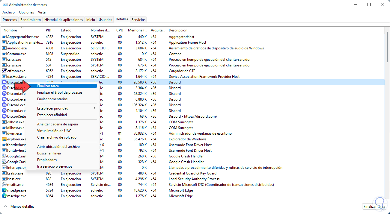 En la pestaña "Detalles" damos clic derecho sobre Discord y seleccionamos la opción "Finalizar tarea":