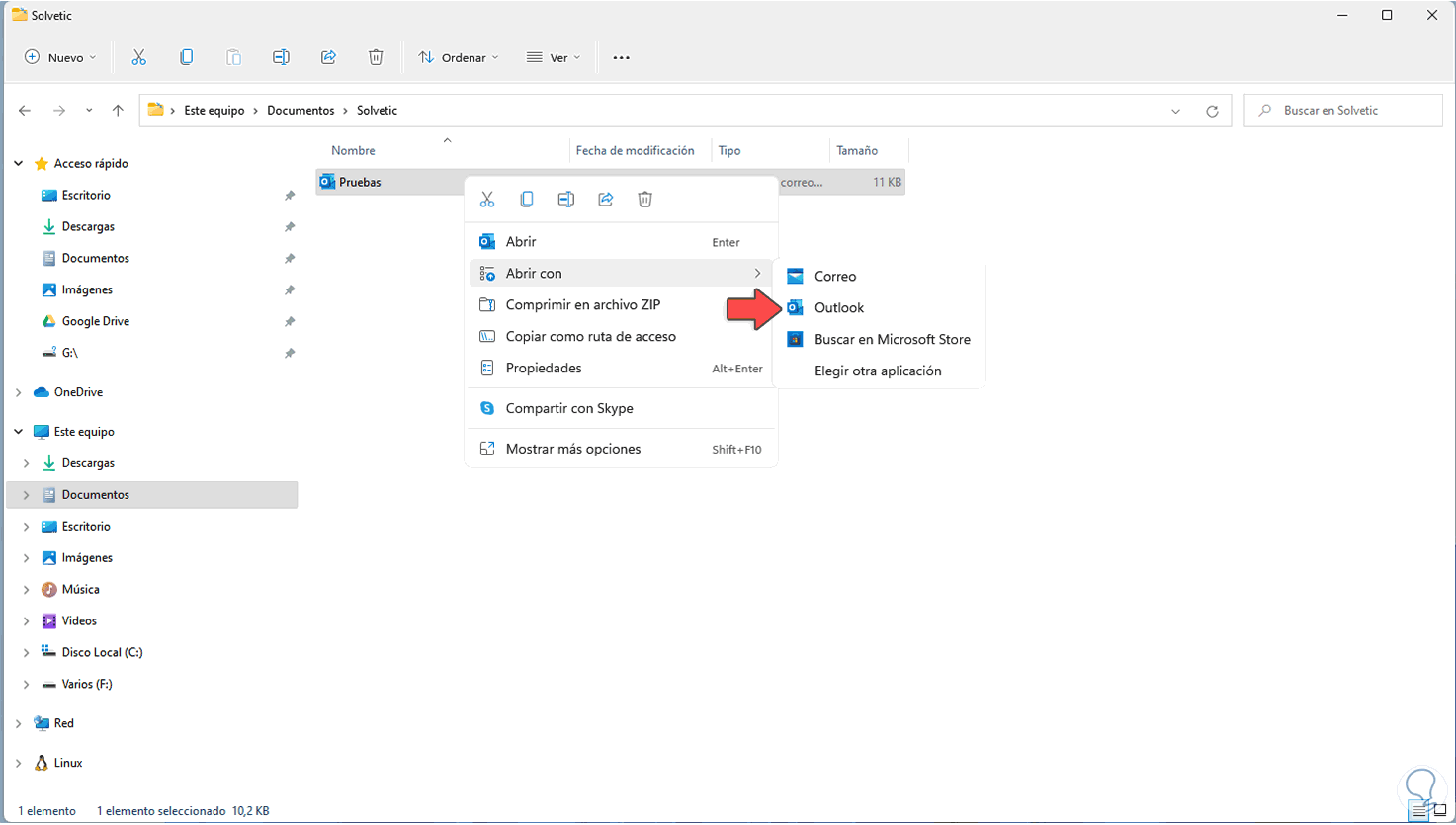 Para abrirlo en el momento necesario, vamos a la ruta donde se guardó el mensaje, luego damos clic derecho sobre este y seleccionamos "Abrir con" y seleccionamos la app deseada: