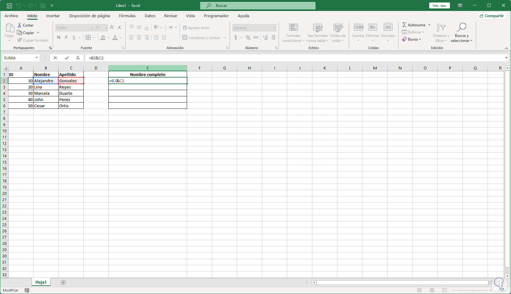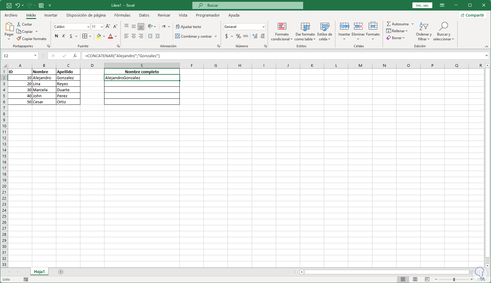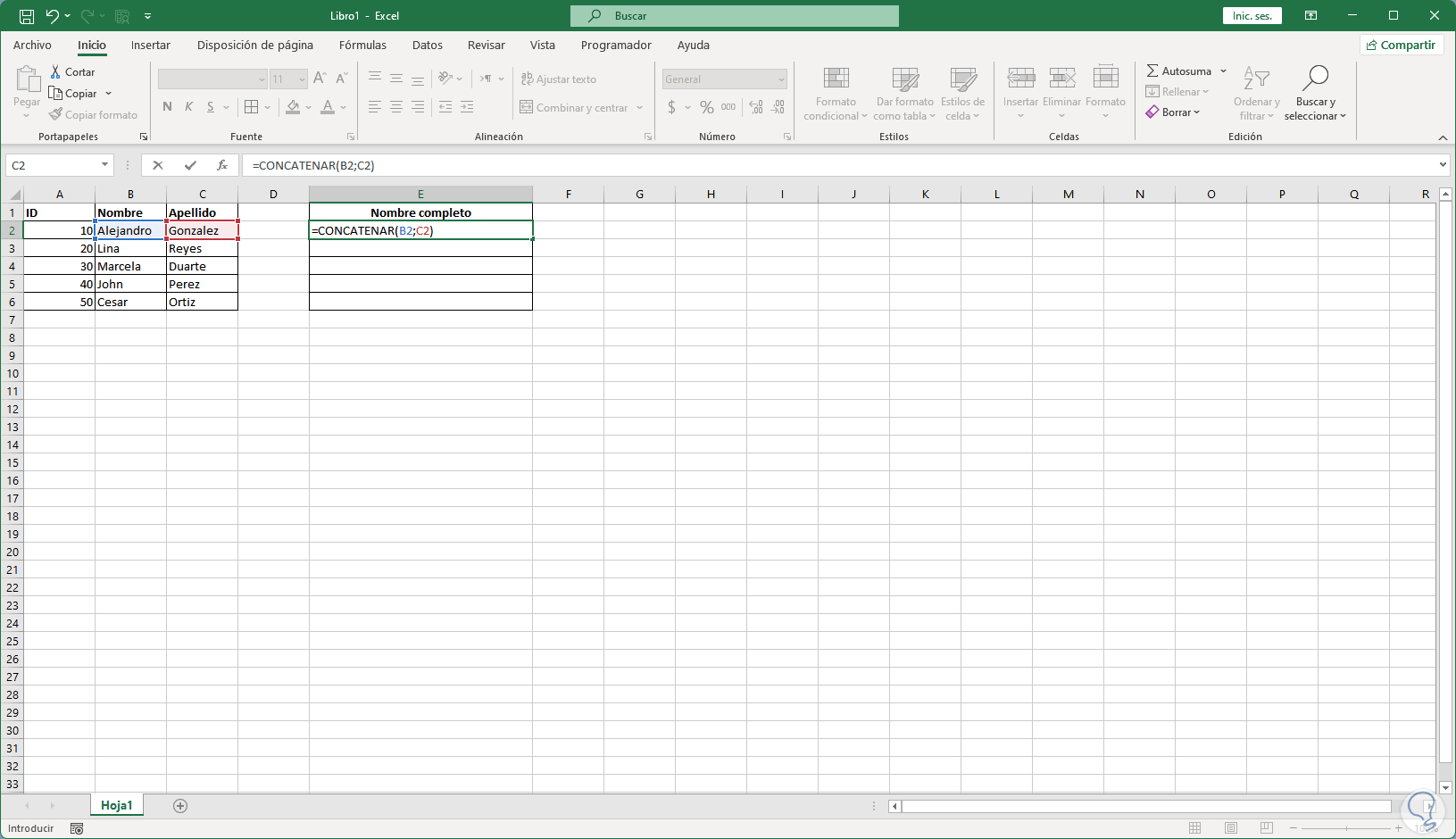 Podemos hacer uso de funciones, en este caso ejecutamos la formula CONCATENAR de la siguiente manera: