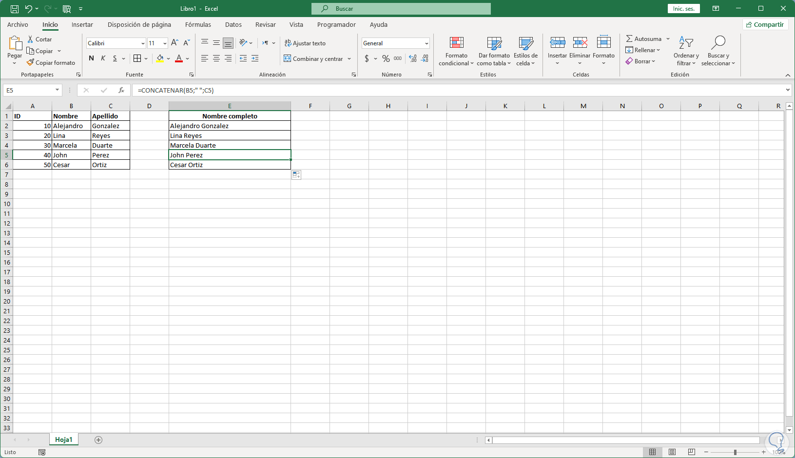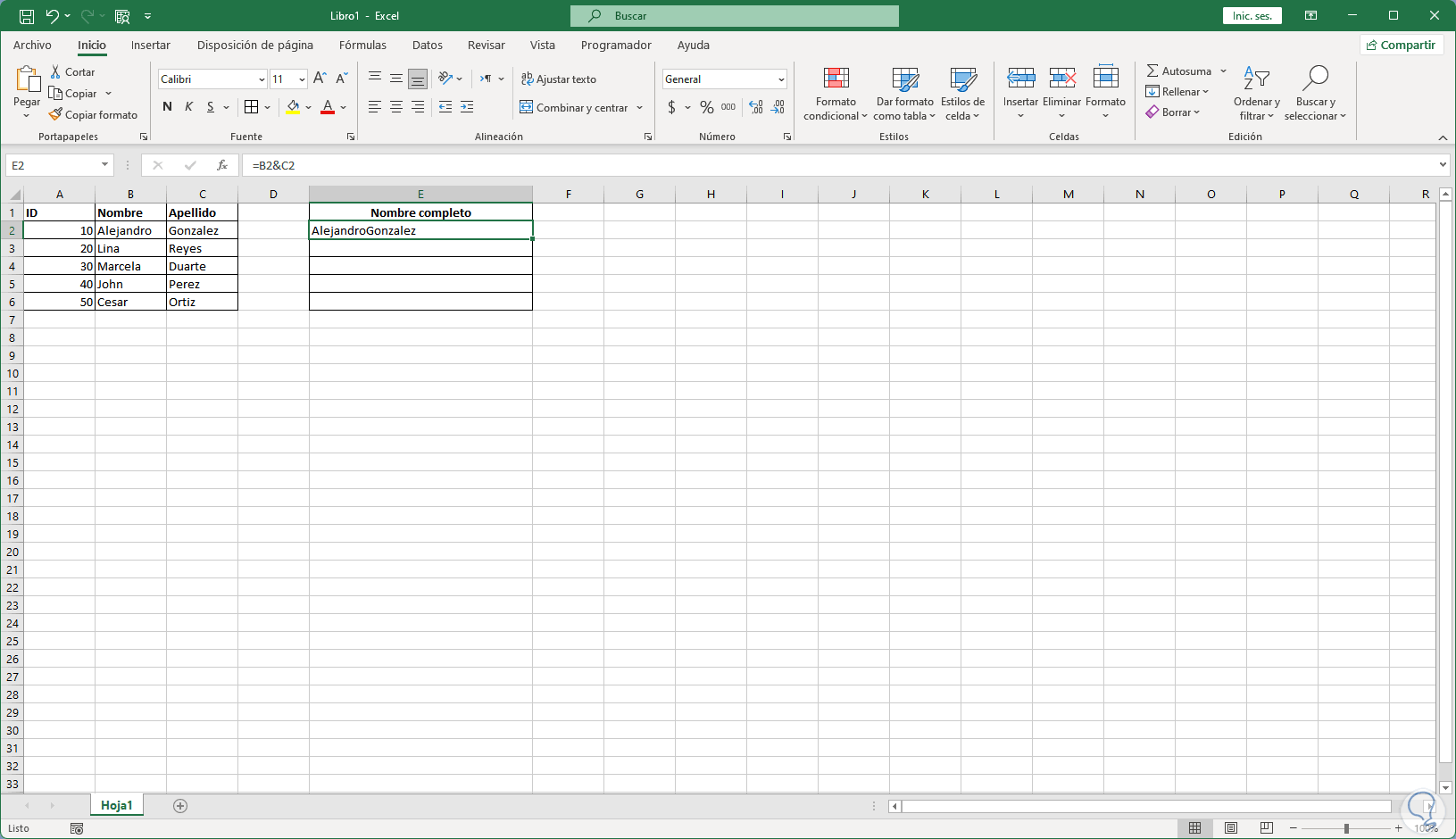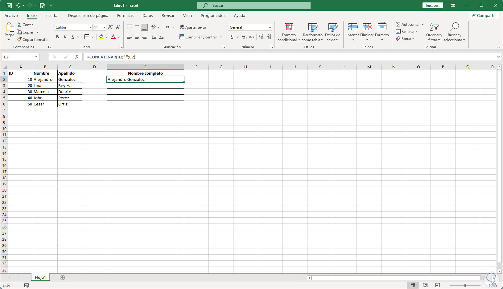 Podemos hacer uso de funciones, en este caso ejecutamos la formula CONCATENAR de la siguiente manera: