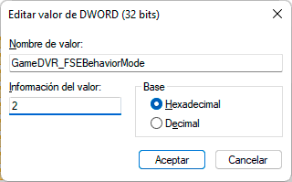 Ahora damos doble clic sobre el valor "GameDVR_FSEBehaviorMode":