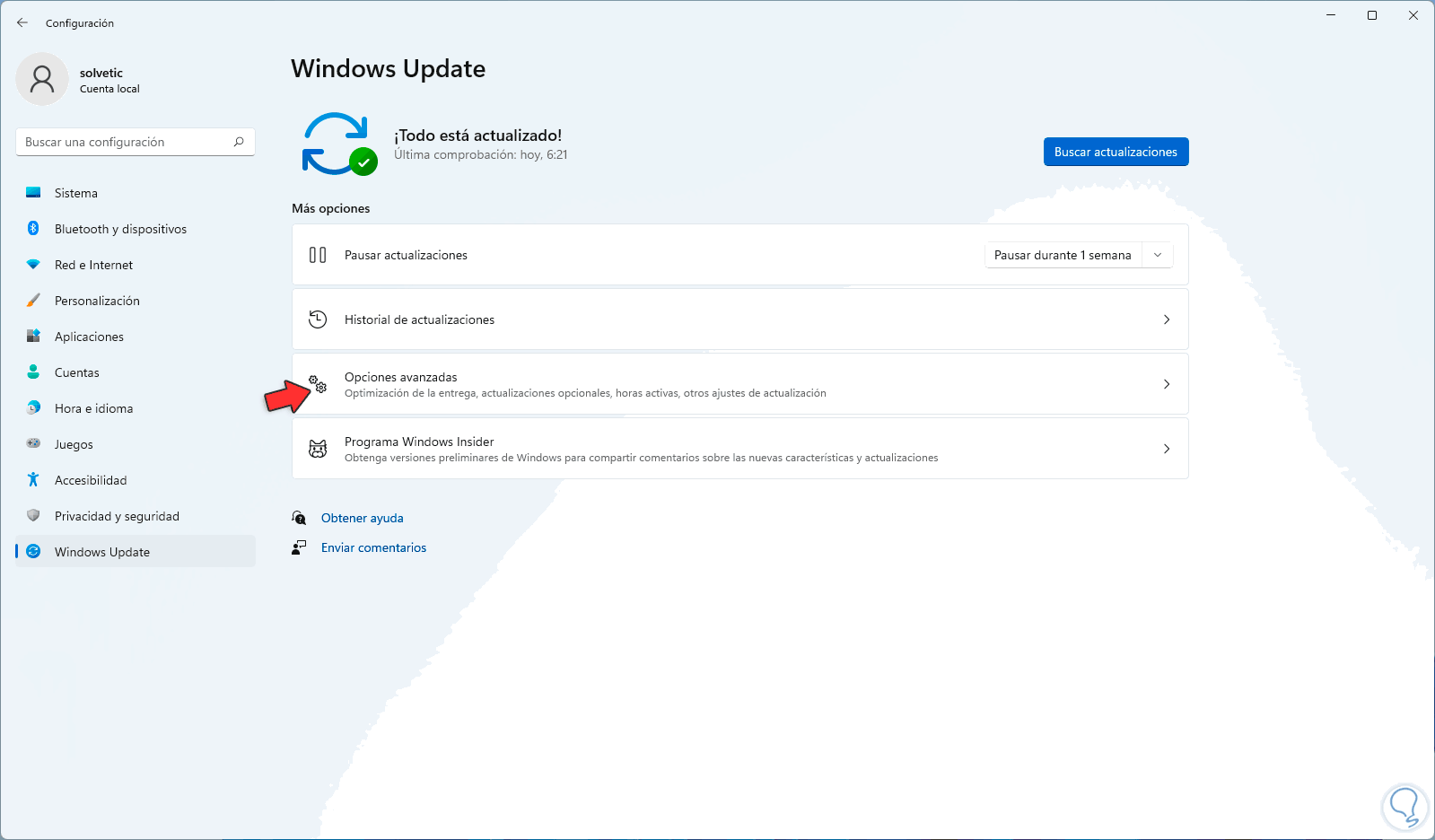 En “Windows Update” damos clic en "Opciones avanzadas":