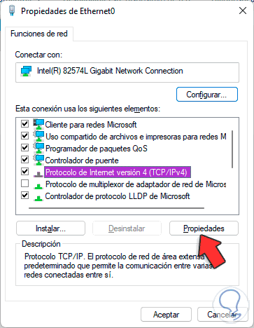 En la ventana emergente seleccionamos el protocolo IPv4 y luego damos clic en "Propiedades":