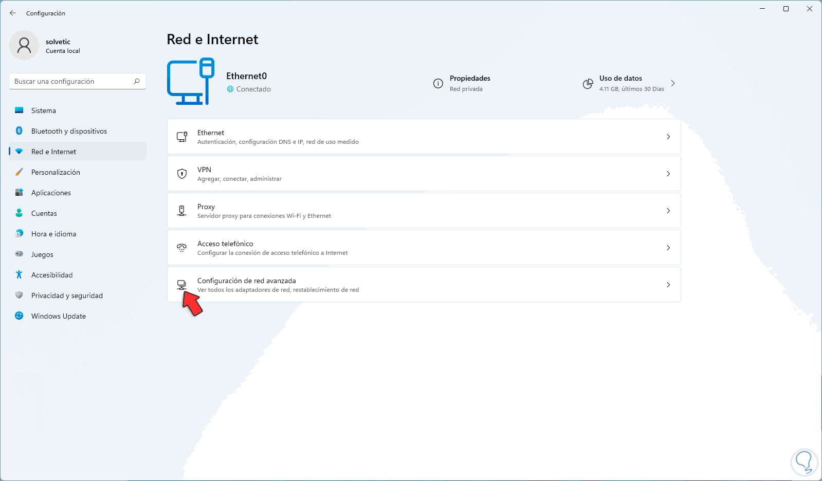 Damos clic en "Configuración de red avanzada" para ver las diversas opciones: