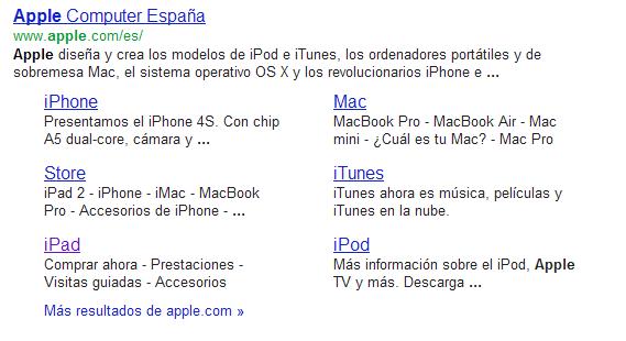 Otro error que suele darse mucho es no subdividir correctamente en categorías los productos, siempre debemos tener una pagina de categorías y luego una ficha de productos, las de categorías son importantes, si Google las detecta y les da relevancia aparecerán justo debajo del enlace en las búsquedas SERP. Como ejemplo podemos observar la web de Apple y las categorías de productos según su relevancia.