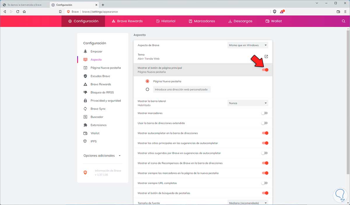 Activamos el interruptor "Mostrar el botón de página principal":