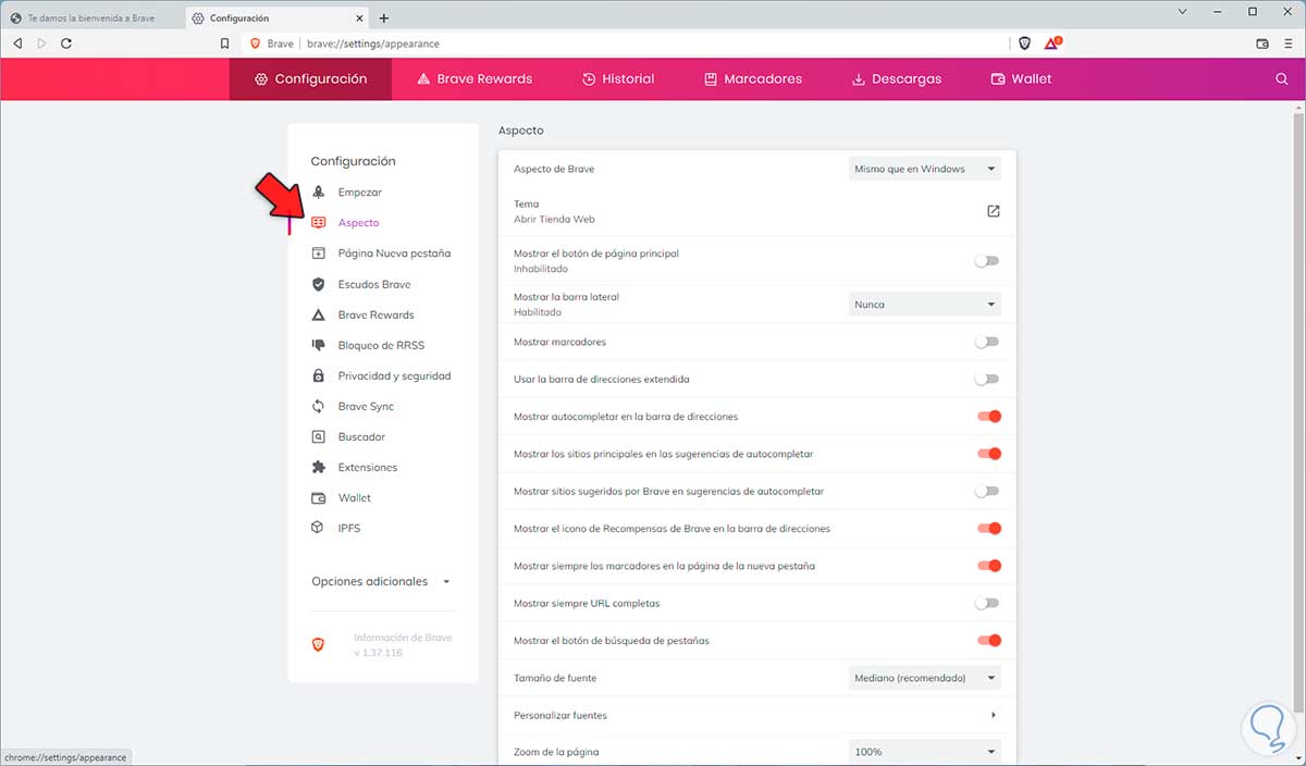 En la siguiente ventana vamos a "Aspecto" donde veremos esto: