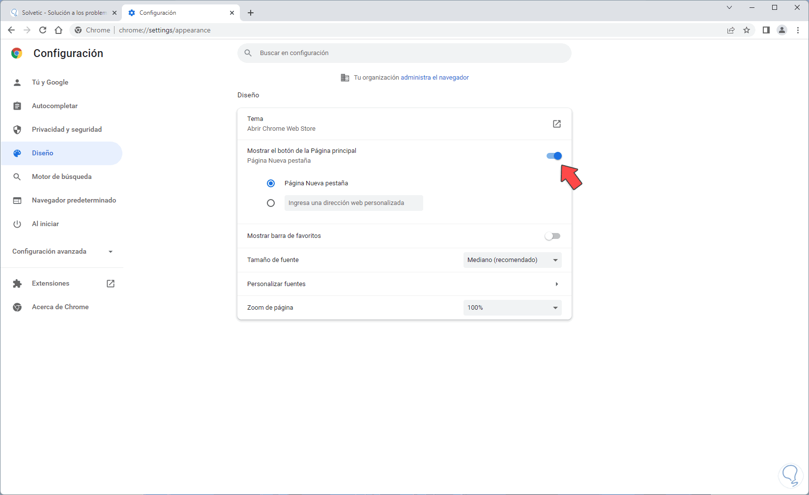 Activa el interruptor "Mostrar el botón de la página principal":