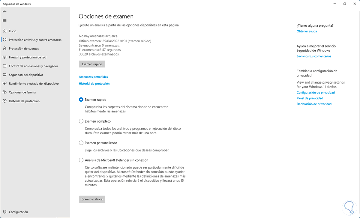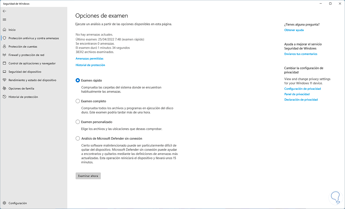 Damos clic en "Examinar ahora" y esperamos que finalice: