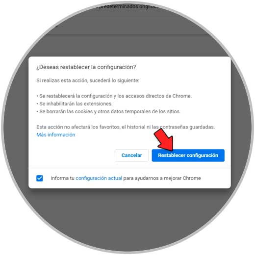 Damos clic en "Restablecer la configuración a los valores predeterminados originales" para ver lo siguiente: