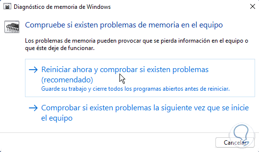 Aquí elegiremos una de las dos opciones, aunque la recomendable es un análisis puntual en "Reiniciar ahora y comprobar si existen problemas"