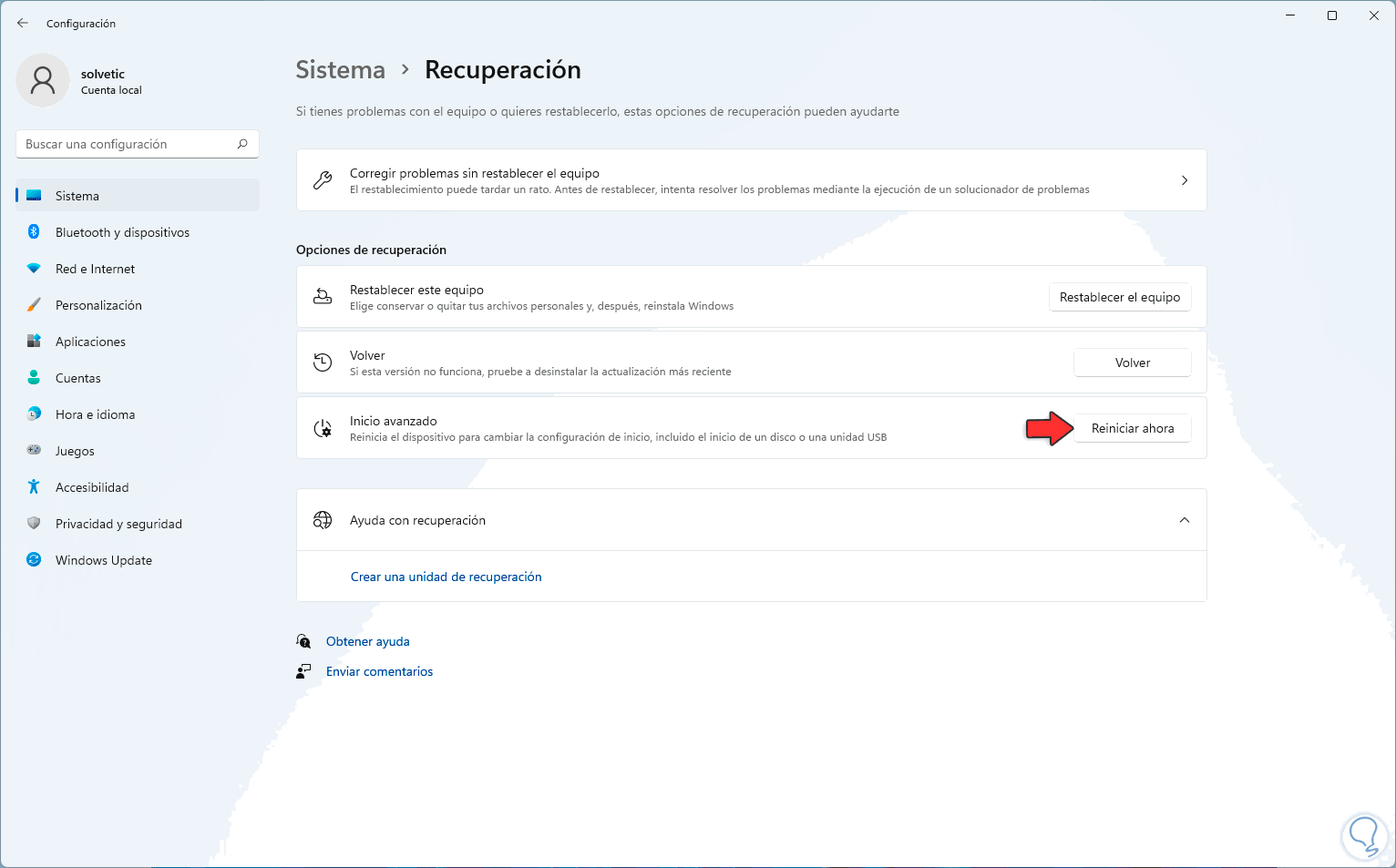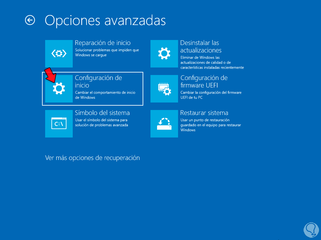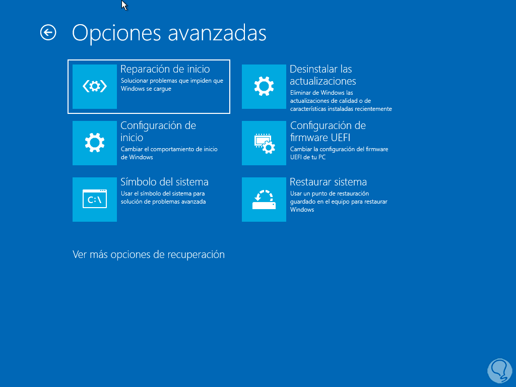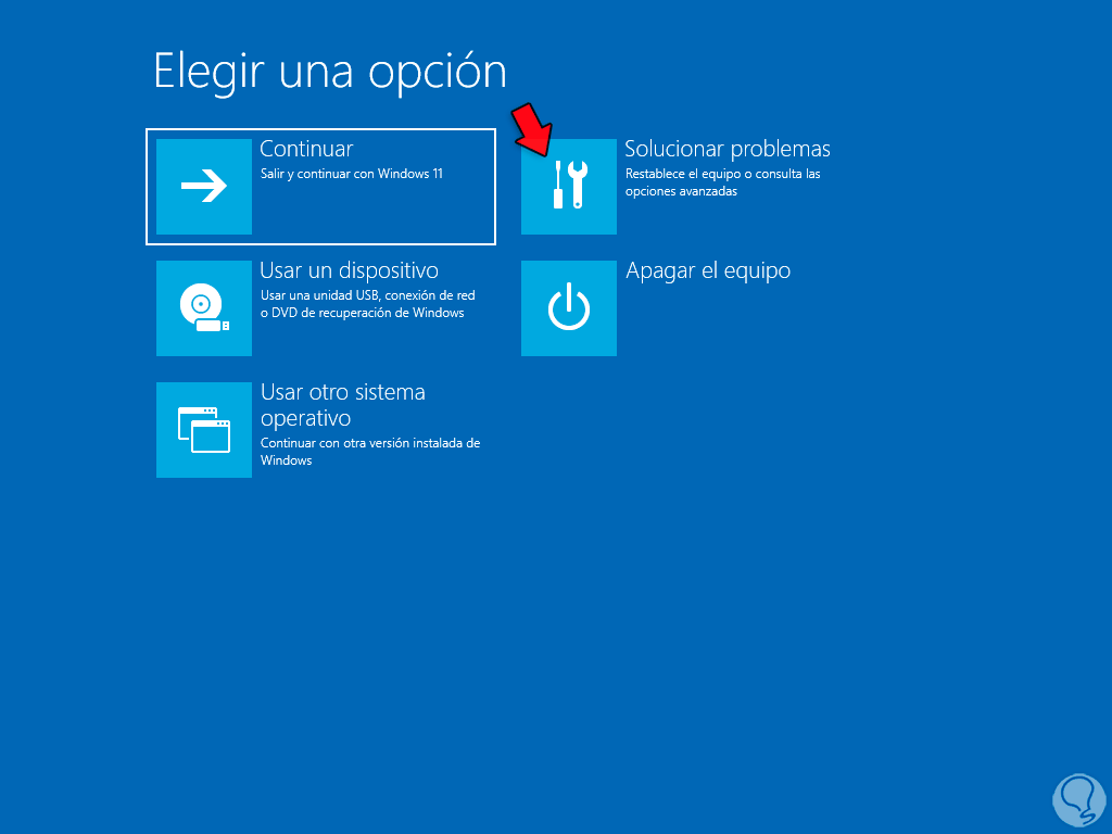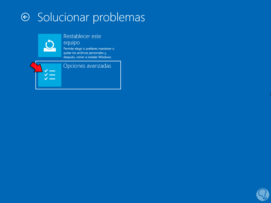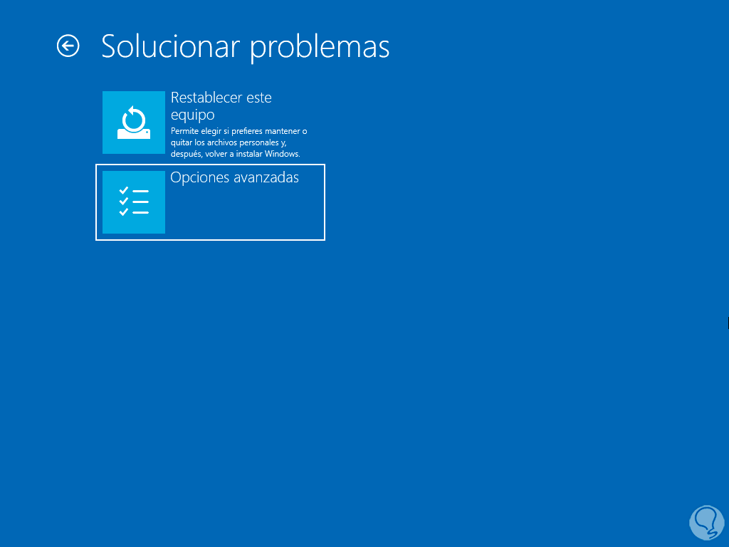 Damos clic en “Solucionar problemas” y luego en “Opciones avanzadas”: