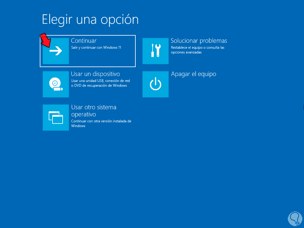 Da clic en "Opciones avanzadas" y luego da clic en "Continuar" para validar que Windows inicia correctamente: