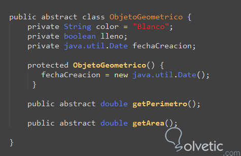 Este sencillo ejemplo nos ofrece unas lecturas interesantes, primero vemos que en la propia definición de clase hemos colocado la palabra reservada abstract, luego hemos definido las características más generales del objeto, es decir, cosas con las que no se pueda definir aún que es realmente, luego construimos uno de los constructores, en este caso uno que inicializa el atributo fechaCreacion.