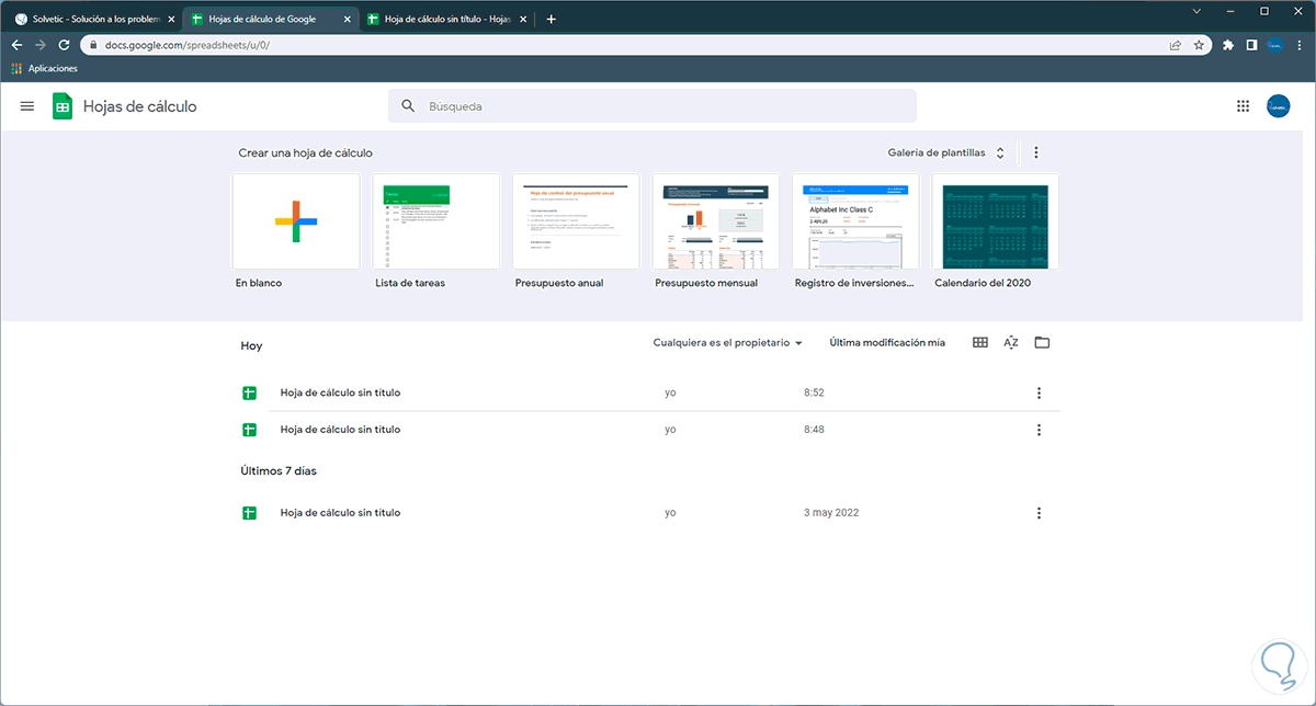 Ahora, es posible organizar las hojas de calculo de Google Sheets por fechas, para ello en la pantalla principal de Sheets veremos las diversas hojas creadas: