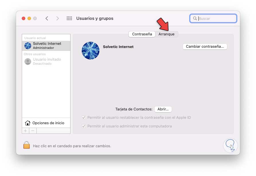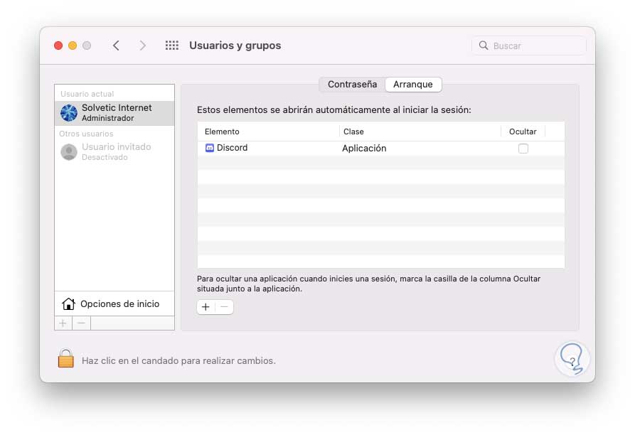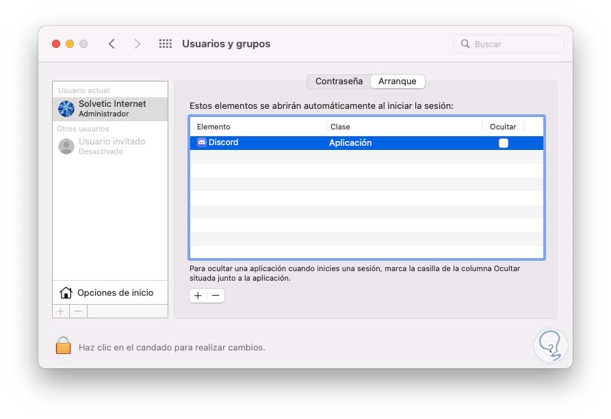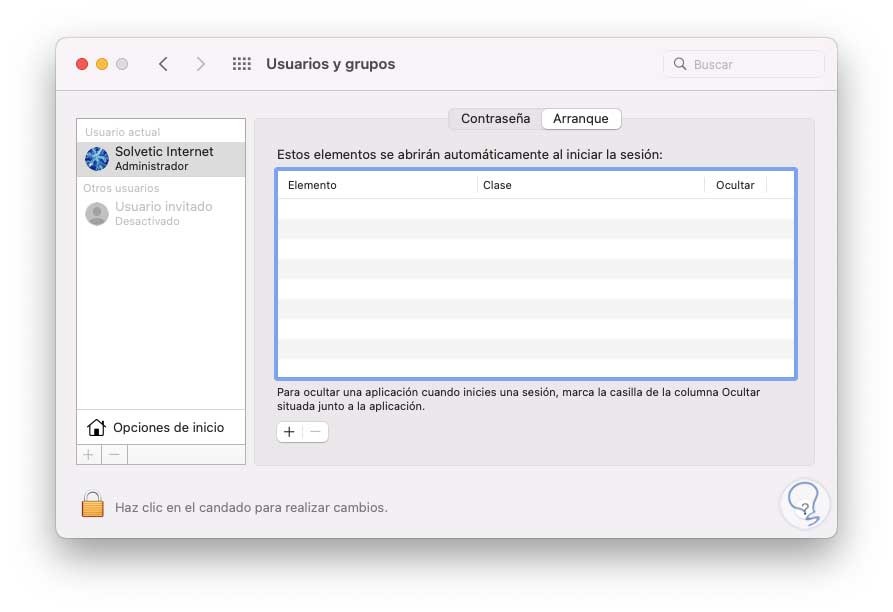 Seleccionamos el usuario y vamos a la pestaña "Arranque" donde veremos las apps que inician junto a macOS: