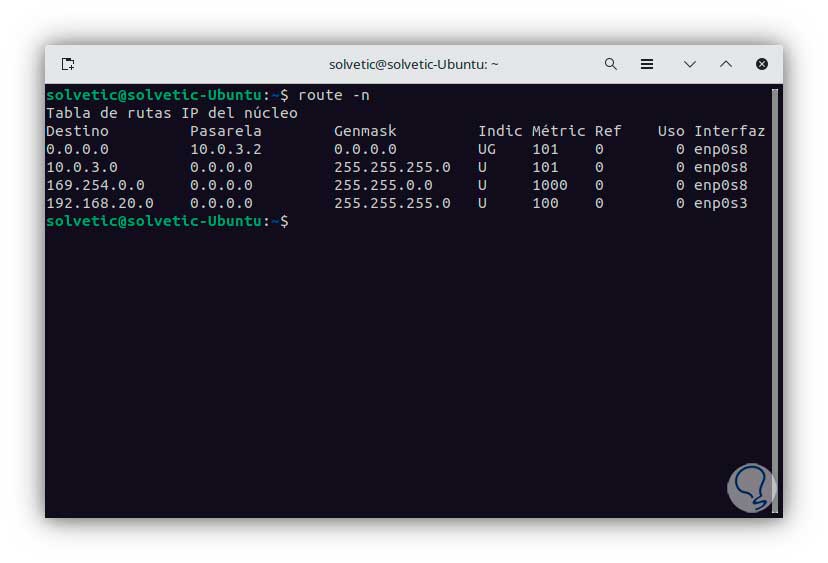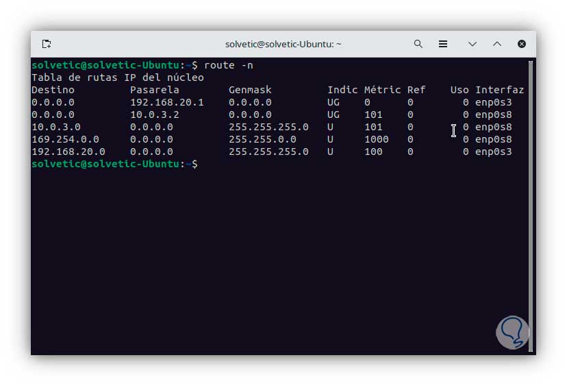 Para este caso usaremos Ubuntu pero el proceso es similar en las demás distribuciones, abrimos la terminal y listamos la IP actual de la puerta de enlace con el comando: