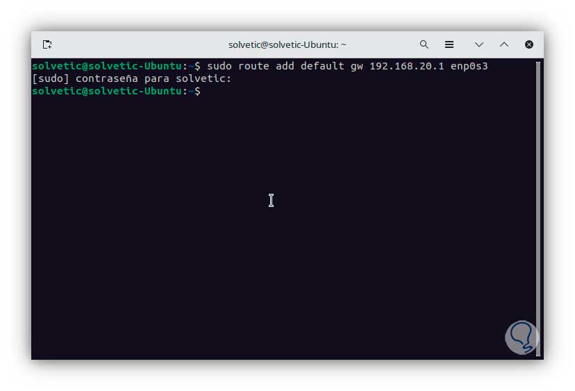 sudo route add default gw "IP" "adaptador”Ingresa la contraseña de administrador: