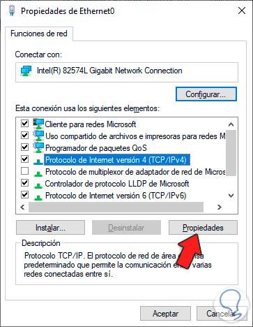 En la ventana emergente seleccionamos el Protocolo de Internet versión 4: