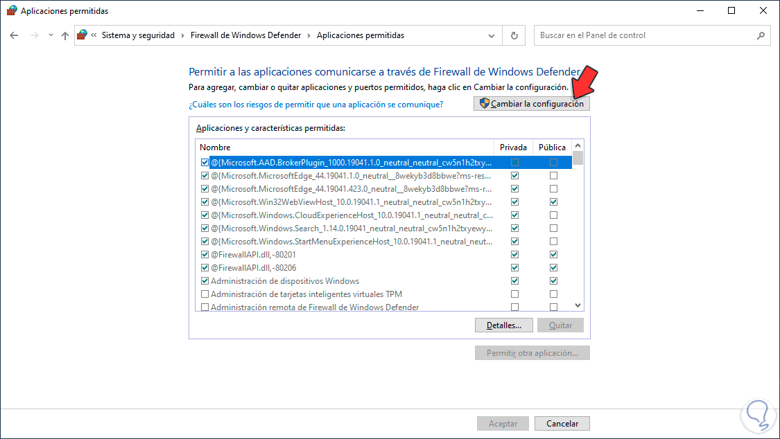 Damos clic en "Permitir que una aplicación o una característica a través de Firewall de Windows Defender" y se abrirá lo siguiente: