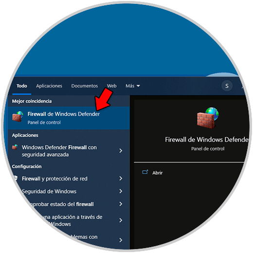 Para este caso usaremos Windows 10 pero muchos de los pasos son idénticos en Windows 11, en el buscador ingresamos "firewall" y damos clic en "Firewall de Windows Defender":