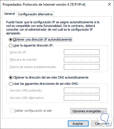Activamos la casilla "Usar las siguientes direcciones de servidor DNS" y configuramos lo siguiente: